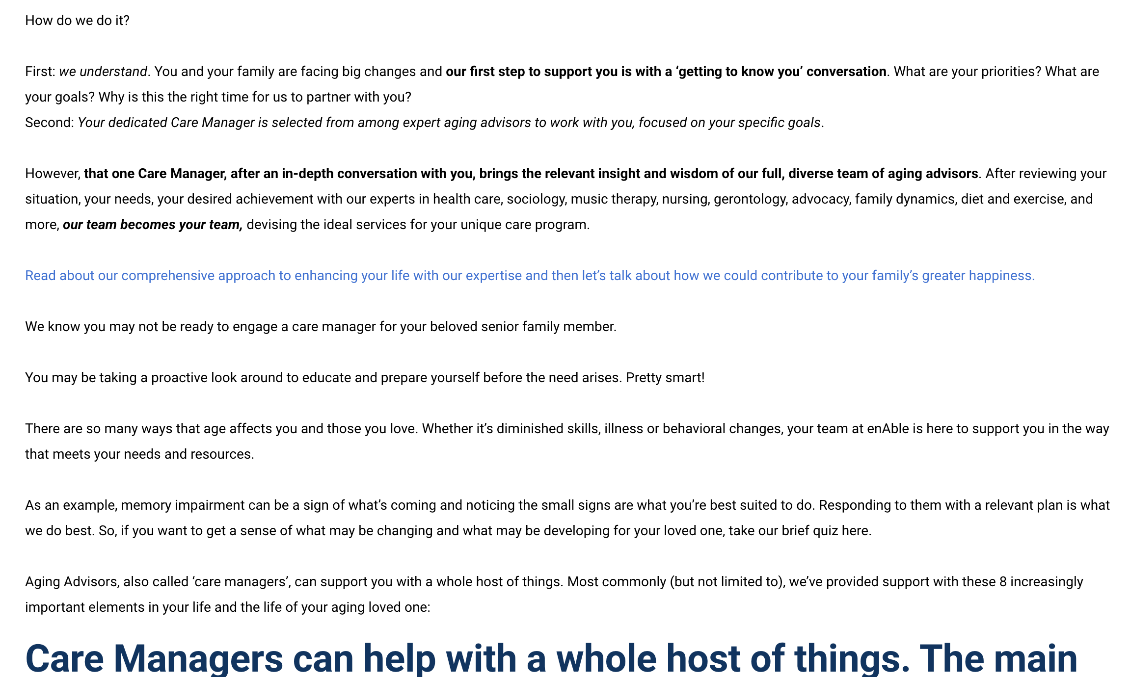 Uh, hang on; there’s another ‘how’ here: How do your clients want to feel as a result of using your care service? This is a biggie; it goes to the very heart of why someone will respond to your messaging and ultimately say yes, no, or not now. Marketing lives for feelings – for understanding what prospects feel when they seek you and what they should be when you’ve applied your services. In the care management world, you face an added challenge: your prospects often want to hide emotions – guilt, embarrassment, resentment, frustration can all be part of what they feel when they contact you and may not want you to see those feelings. So, your marketing role is to engage someone’s attention and interest; to let them know you understand how they might be feeling.