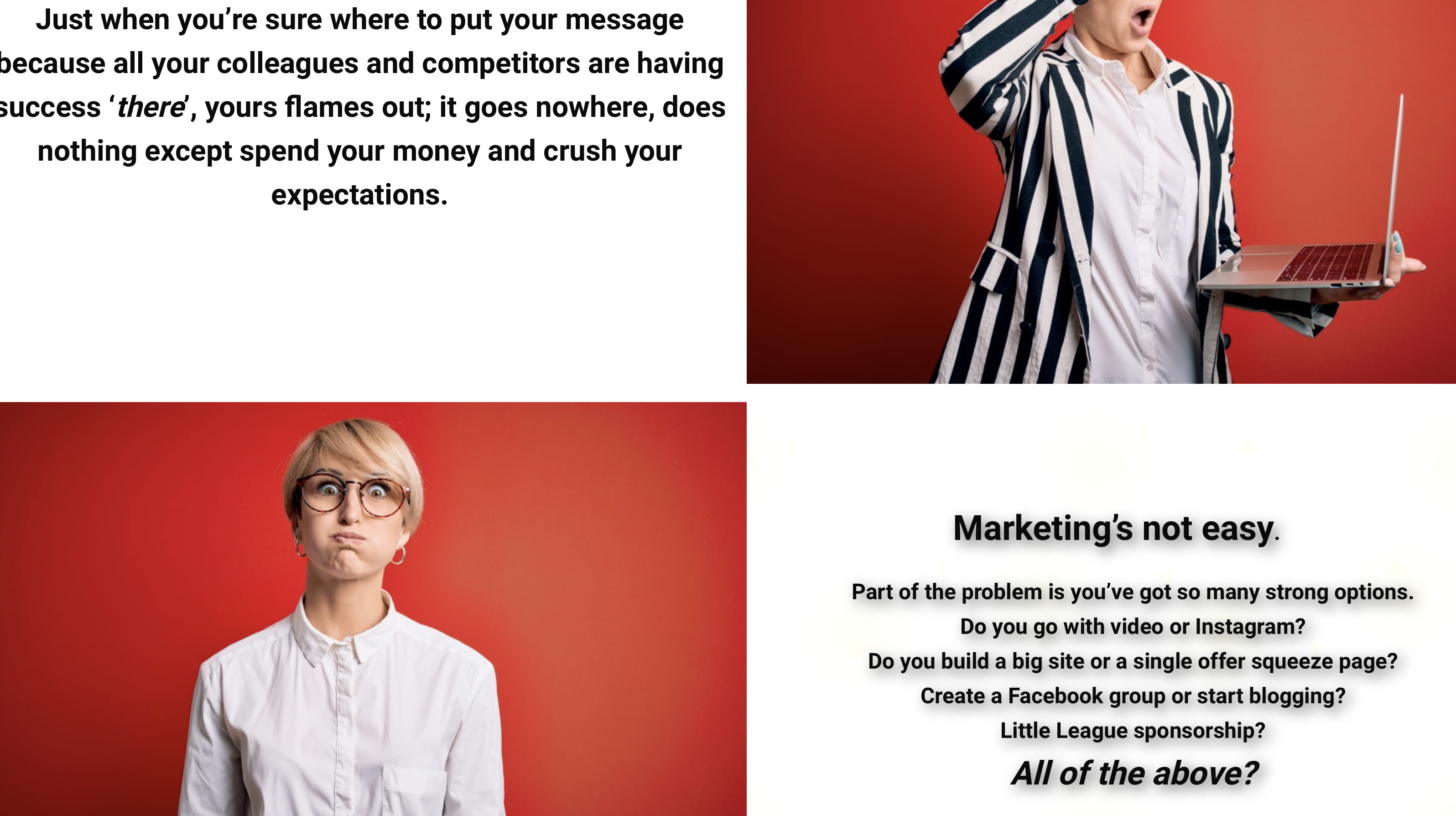 Postcards, Squeeze Pages, Blogs, Social Media Posts, Site Pages, Email Series