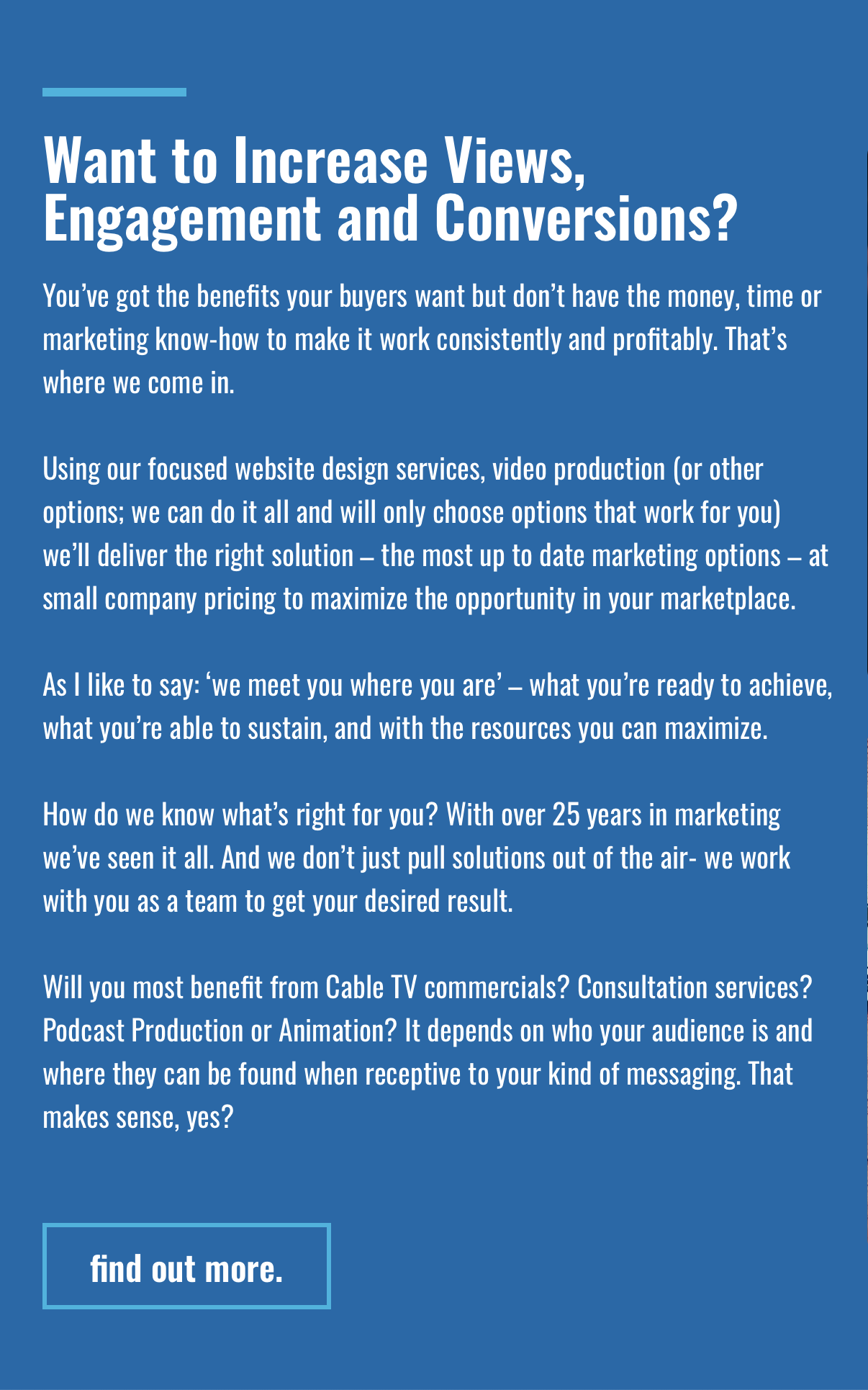 We want you to get maximum impact for your message. And, once we know who is your audience and where they are when they are receptive to your message, we may leverage content; a blog may become a video. An email may become a Facebook Live event or series of social media posts.