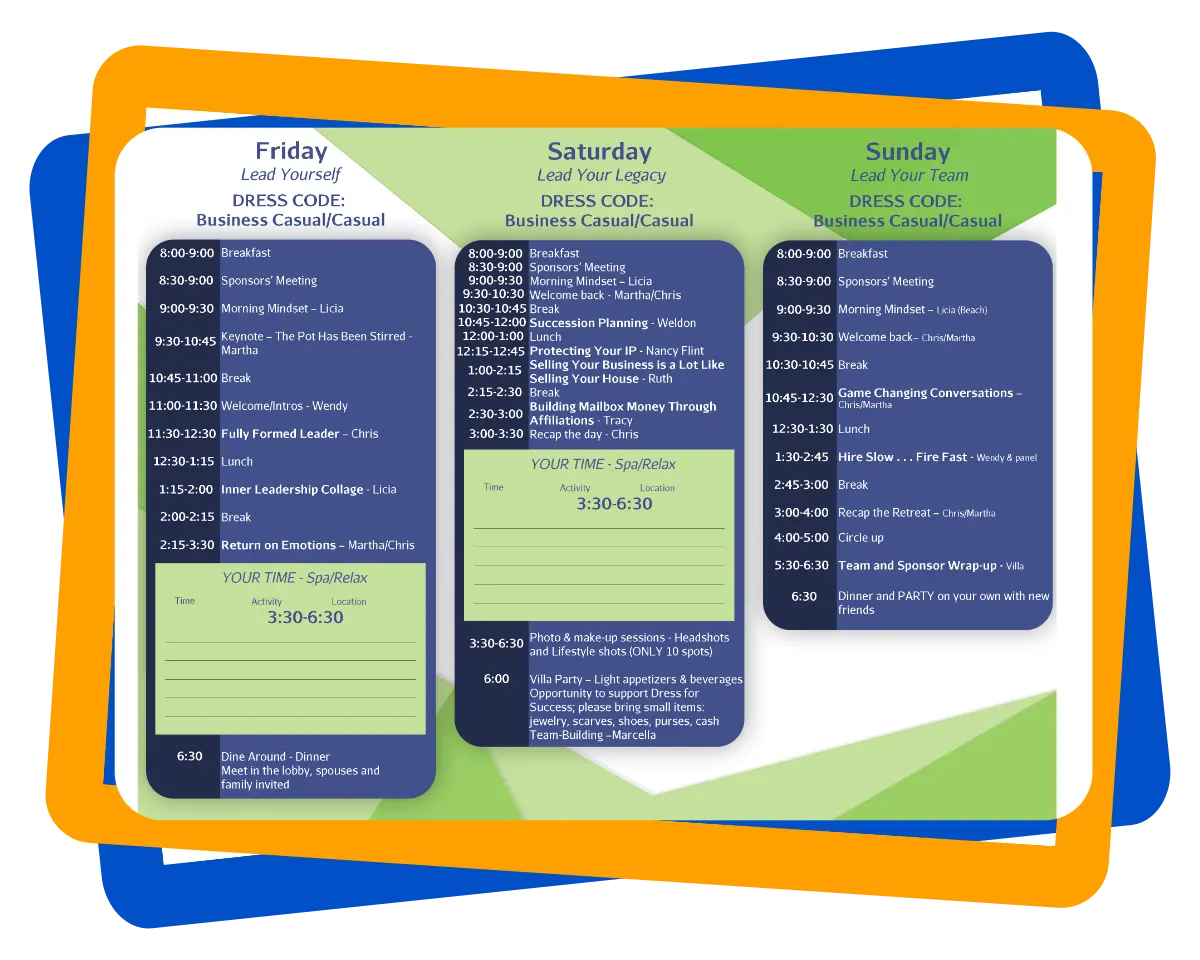 And, do you see that tri-fold brochure? That was not easy. The client, hosting a 4-day leadership retreat, needed a brochure with all events listed with room for notes on a single page. And – we needed to get it done in under 48 hours! The color and shape contrasts help to ease focus on the page and it’s all there; whew!