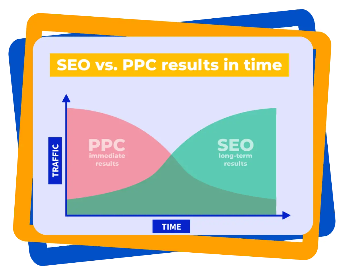 If you have $10,000 and invest everything in SEO, you won’t see any results on the SERP for the first few months, but then (if everything is done well), growth starts, and lasts longer with regular maintenance.